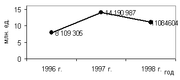 3. увеличение скорости оборотов запасов товаров посредством системы SP с 39 дней в 1996 г. до 32 дней в 1998 г. Сопоставление целей коммерческой деятельности и выбранной стратегией коммерческого поведения обнаруживает определенное логическое расхождение. Цели коммерческой деятельности – увеличение объема продаж и доли рынка. Предполагают рассматривать вопросы: связанные с эластичностью цены; осознанием цены покупателем; системой МК (маркетинговых коммуникаций); использованием неценовых методов в корреляции с ценовыми; позиции и реакцию конкурентов. Стратегия «снижения цены» скорее предполагает достижение целей возмещения затрат и получения прибыли. Следовательно, имеет место несоответствие целей и выбранной стратегии деятельности. С точки зрения автора, это стало возможным не использованием менеджментом стратегического подхода в планировании коммерческой деятельности. Данный вывод подтверждается тем, что компания не достигла в 1998 году поставленных задач. Произошло падение объема продаж, уменьшение доли рынка компании, в то же время – произошло увеличение прибыли. Рис. 2.5 Доля рынка компании «Дальост» Рис. 2.6 Объем продаж товара (количество единиц) «Дальост»