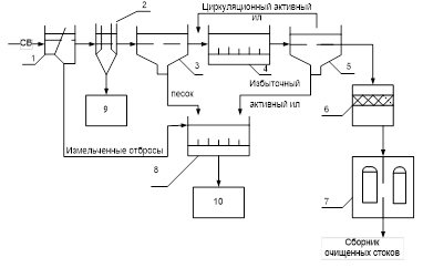 Рисунок 9. Традиционная технологическая схема очистки сточных вод 1- решетки; 2 – горизонтальные песколовки с круговым движением воды; 3 – первичный радиальный отстойник; 4 – аэротенк-вытеснитель с регенератором; 5 – вторичный радиальный отстойник; 6 – биопруды с естественной аэрацией; 7 – аэробный стабилизатор; 8 – песковые площадки; 9 – иловые площадки.