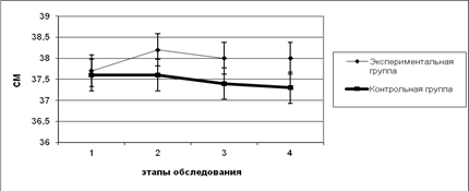 Рис.2 Динамика изменений объема больного бедра, см. 3. Показатели окружности здоровой голени. Первое обследование Контрольная группа - 37,6 ± 2,1 см Экспериментальная группа - 37,7 ± 2,3 см (Р>0,05) Второе обследование (спустя 10 дней) Контрольная группа - 37,6 ± 1,8 см Экспериментальная группа - 38,2 ± 3,0 см (Р>0,05) В контрольной группе изменений не произошло, в экспериментальной немного увеличился объем мышц голени, что связано с применением осевой нагрузки и изометрических упражнений. Третье обследование (спустя 20 дней) Контрольная группа - 37,4 ± 1,8 см Экспериментальная группа - 38,0 ± 2,9 см (Р>0,05) Как в контрольной, так и в экспериментальной группах происходит незначительное уменьшение объема голени. Четвертое обследование (спустя 30 дней) Контрольная группа - 37,3 ± 2,0 см Экспериментальная группа - 38,0 ± 2,9 см (Р>0,05) При измерении окружности здоровой голени, как в контрольной, так и в экспериментальной группах, разница окружностей составила примерно 0,1-0,2 см.