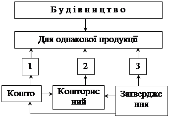 Спв – накладні витрати з нормою витрат Нн . З урахуванням формули (3) ціна будівельної продукції через прямі витрати дорівнює Ц = Спв (1 + Кн ) (1 + Кп ). (4) Третя особливість стосується порядку формування та затвердження цін на будпродукцію. В кожному проектному інституті визначається кошторисна вартість об’єктів і споруд, яка в складі проектів затверджується відповідними органами замовників. Таким чином, схема ціноутворення в будівництві має такий вигляд: