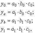 где a0 , b0, c0 - базисные значения факторов, оказывающих влияние на обобщающий показатель у; a1 , b1 , c1 -фактические значения факторов; ya , yb , -промежуточные изменениярезультирующего показателя, связанного с изменением факторов а, b, соответственно. Общее изменение Dу=у1 –у0 складывается из суммы изменений результирующего показателя за счет изменения каждого фактора при фиксированных значениях остальных факторов: