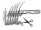 рис.16 Снятие волос на пальцах. Верхний конец расчески указывает линию среза волос. Укорачивание длинных волос можно производить ножницами и опасной бритвой. При работе бритвой расчесанную прядь волос держат большим и указательным пальцами, бритву подносят к волосам практически под прямым углом. Так обрабатывают только мокрые волосы. Длинные негустые волосы можно укоротить ножницами, предварительно скрутив в тугой жгут. После этого нужно подровнять линию среза прямыми ножницами так, чтобы волосы были длиннее, чем предусмотрено стрижкой, на 2—3 см. Срезать волосы можно по-разному. Если вы держите ножницы перпендикулярно стержню волоса, то срез имеет форму круга и его называют прямым. При наклонном положении ножниц, под углом к стержню волоса, получается овальный срез, его называют косым.