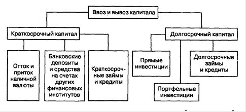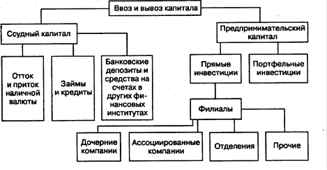 Рис.1. Деление ввоза и вывоза капитала на краткосрочный и долгосрочный К краткосрочному капиталу относятся вложения на срок менее года. Это торговые кредиты, банковские депозиты, средства на счетах других финансовых институтов, краткосрочные коммерческие бумаги и другие формы капитала. Долгосрочными являются вложения предпринимательского капитала, кредиты коммерческих банков, иностранных государств и международных организаций. К ним относятся вложения более чем на 15лет. 3. По источникам происхождения капитал делится на государственный (официальный) и частный . К государственному капиталу относятся средства федерального правительства, местных органов власти и других государственных институтов, а также капитал международных межправительственных организаций, включая Международный валютный фонд (МВФ). Официальные средства предоставляются обычно в ссудной форме - государственные займы, ссуды, гранты, помощь, кредиты международных организаций. Безвозвратные ссуды и гранты не являются капиталом; в этом случае иностранные государства выступают в качестве не кредитора, а донора. Кредиты МВФ и Международного банка реконструкции и развития (МБРР), который входит в систему Всемирного банка, предоставляются правительствам принимающих стран и имеют целевое назначение. Кредиты МВФ поступают стране-получателю по частям. Предоставление следующей части зависит от того, выполняет ли страна-получатель взятые на себя обязательства, под которые был предоставлен кредит. Источником официального капитала являются бюджетные средства, т.е. средства налогоплательщиков. Решения о перемещении официального капитала за рубеж принимаются совместно правительством и органами представительной власти на основе межправительственных соглашений. Преобладание официальных средств в притоке финансовых ресурсов свидетельствует о неблагополучном экономическом положении страны, что ограничивает ее возможности привлечения частных ресурсов. Частный капитал - это средства из негосударственных источников, т.е. собственные или заемные средства частных фирм, банков, преимущественно транснациональных, а также фондов и других негосударственных институтов. Они перемещаются за рубеж на рыночных условиях по решению руководящих органов соответствующих организаций. Частные средства поступают в зарубежные страны и через такие международные организации, как Международная финансовая корпорация (МФК), Европейский банк реконструкции и развития (ЕБРР), на основе заключаемых этими организациями соглашений с частными фирмами. Основным источником получения частных средств в ссудной форме является международный финансовый рынок, который трансформирует бездействующие валютные средства в капитал и перераспределяет его между эмитентами и заемщиками разных стран. В структуре заимствований неблагополучных стран преобладают официальные ресурсы. Страны с развитой экономикой и другие страны без платежных проблем привлекают ссудный капитал преимущественно из частных источников. 4. Капитал бывает заемным , т.е. образующим долги, и не заемным , или не образующим долги. К не заемным средствам относятся прямые инвестиции и портфельные инвестиции в акционерный капитал. К заемным средствам относятся кредитные формы привлечения капитала - займы, кредиты, долг