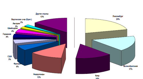 Вывод о том, что значительная доля привлеченного из-за рубежа капитала в форме ссуд и займов имеет российское происхождение, косвенно подтверждается и страновым распределением ввозимого в Россию капитала. Большая его часть осуществляется либо через страны с облегченным налоговым режимом и страны - политические убежища (Нидерланды, Великобритания, Люксембург), либо через оффшорные зоны (Кипр, Виргинские острова) - см. рис.6.