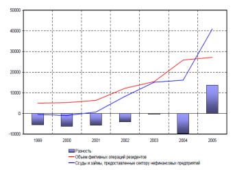 Рис.6. Страновое распределение иностранных инвестиций, направляемых в Российскую Федерацию в 2004 году Дополнительным доводом в пользу отечественного происхождения определенной части ввозимого в Россию капитала является сопоставление его притока с динамикой утечки капитала. Как видно из рис.7, отмечается достаточно четкая зависимость между утечкой российского капитала и притоком капитала нерезидентов в форме ссуд и займов. Превышение размера утечки над объемом предоставленных ссуд и займов в 2004 г. (обусловленное повышением рисков вложений в российскую экономику в связи с делом ЮКОСа) было компенсировано более объемными, по сравнению с утечкой, вложениями нерезидентов в следующем, 2005 году.