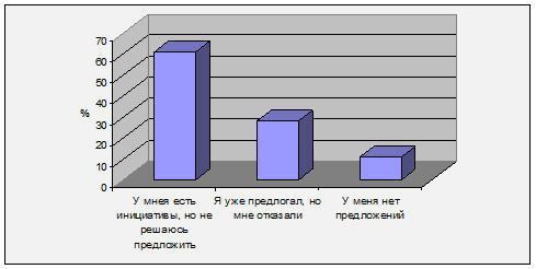 *Источник: собственные наблюдения на основании опроса сотрудников БМЗ 2. Сфера профессиональной деятельности. Сфера профессиональной деятельности должна прежде всего обеспечивать материальные потребности человека. В странах с развитой экономикой, как отмечает МакКлелланд, у большинства населения потребности низшего уровня удовлетворены. В странах с переходной экономикой удовлетворение материальных потребностей все еще остается актуальным, но определенные сдвиги в этом направлении тоже есть. С другой стороны, именно профессиональная деятельность открывает для работающих широкие возможности для реализации их потребностей высшего уровня. Сфера профессиональной деятельности в первую очередь формируется организацией, в которой работает человек (но не ограничивается ею). Организация через стратегию, предоставление материальных и финансовых ресурсов, особенности своей функциональной структуры и менеджмента, систему оценки и вознаграждения создает определенные условия — более или менее благоприятные — для реализации творческого и интеллектуального потенциала своих работающих. Даже талантливые сотрудники мало чего смогут достичь, если организация просто не имеет ресурсов для воплощения их замыслов или менеджмент не поддерживает и не ценит их усилий. Поскольку каждая организация сама находится в постоянном взаимодействии с рыночной средой, то к группе факторов влияния следует отнести также основных игроков рынка (клиенты, партнеры по бизнесу, конкуренты, профессиональные общества, законодательные, государственные органы), которые определяют экономическую ситуацию в определенной отрасли хозяйства и конкуренцию на рынке труда. На БМЗ воплощение творческих замыслов работника сильно затруднено из-за жесткой организации и субординации. Опрос показал, что большинство работников имеет творческие задумки по улучшению эффективности работы, но не могут предложить их ввиду ряда причин: вышестоящий руководитель не поймет такой инициативы, не выслушают и т.д.(рис. 3).