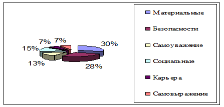 Рисунок 3 – Структура мотивации труда персонала в ООО «Ковчег» Исследования, проведенные в 2008–2010 гг., показывают, что общей закономерностью, которая прослеживается у всех групп респондентов, является наличие ярко выраженных материальных потребностей, но не менее важное место занимают гарантии безопасности. Последние особенно свойственны рабочим и служащим, начавшим свою трудовую деятельность при плановой экономике СССР. Наименьший процент сотрудников отличает потребность сделать карьеру, несмотря на то, что многие имеют высшее образование, а часть учится в институтах. Это можно объяснить тем, что руководство завода не стремится проводить ротацию кадров и использовать свои внутренние резервы при освобождении вакансий более высокого порядка. Однако потребности высшего порядка превышают потребность в самовыражении, и, следовательно, сотрудники ООО «Ковчег» – люди активные, знающие, что они хотят от жизни. Это обстоятельство является важным мотивирующим фактором, и руководству следует более тщательно наблюдать за желаниями каждого работника в отдельности. Анализ системы оплаты и стимулирования труда позволил выделить следующие проблемы: - высокий процент текучести кадров; - недостаточные условия и организация труда; - отсутствие условий для самореализации потенциалов сотрудников; - низкий уровень удовлетворенности трудом. Систему стимулирования труда нельзя признать эффективной, у работников низкий уровень мотивации. Существует низкий уровень гарантированной оплаты труда, а также существует низкая доля тарифа, которая свидетельствует о том, что на предприятии нормы труда начинают все более и более перевыполняться вследствие их малой напряженности и постепенно устаревать, что рост заработной платы обусловливают факторы, зависящие не от работника, а от предприятия в целом, и не учитываемые в нормах труда работников. В тоже время, на предприятии низкая доля тарифа, что негативно влияет на организацию оплаты труда: обесценивается значимость квалификации, возрастает субъективизм, становится бесполезным весь накопленный арсенал норм и нормативов трудовых затрат. Для устранения этих недостатков необходимо разработать мероприятия по созданию эффективной системы управления персоналом и мотивации на предприятии Итак, в системе управления персоналом и мотивации работников ООО «Ковчег» существует много нерешенных проблем, обусловленных, в первую очередь социальными изменениями. В результате таких изменений персонал организаций оказался в большей части недомотивированным, что выражается в недостаточно высокой самооценке, недооценке своей значимости в коллективе, а также в том, что работники не видят перспектив дальнейшего развития, равно как и не видят внутренних стимулом к использованию всего потенциала, который у многих не задействован. Итак, заработная плата – один из важных факторов, движущих работником, как правило, человек хочет получать вознаграждение за выполнение своих обязанностей в течение определенного времени, удовлетворяющее его материальным и духовным запросам и ценностям. Материальная заинтересованность – один из общечеловеческих стимулов трудовой активности. Наиболее распространенным стимулом является необходимость обеспечить своим детям надлежащее воспитание и образование, з