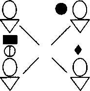 Рис. 5.6. Совместно-последовательный тип деятельности Так, например, при изготовлении досок вначале кто-то спиливает дерево, потом кто-то перевозит его на фабрику, затем Кто-то отделяет ствол от ветвей, потом кто-то измеряет ствол и рассчитывает, сколько и какого размера досок может получить и какова должна быть схема распилки, и лишь потом ствол поступает на распиливание. 3) Совместно-индивидуальный тип деятельности отличается тем, что взаимодействие между участниками труда минимизируется (рис. 5.7). Каждый из исполнителей выполняет свой объем работы, специфика деятельности задается индивидуальными особенностями и профессиональной позицией каждого. Каждый из участников процесса представляет результат труда в оговоренном виде и в определенное место. Личное непосредственное взаимодействие может практически отсутствовать и осуществляться в непрямых формах (например, через телефон, компьютерные сети и т.д.). Объединяет разных исполнителей лишь предмет труда, который каждый из участников обрабатывает специфическим образом. Примеры этого типа деятельности — индивидуальная переноска тяжестей или независимый анализ различных аспектов одного и того же явления разными специалистами.