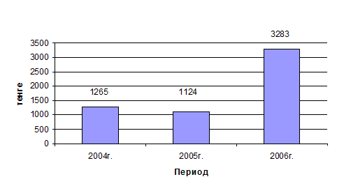 Структура дохода от оказания услуг гидрометцентра по программам можно назвать стабильным. Прослеживается небольшое увеличение доли дохода в 2006г от гидрологической информации (1%), увеличение поступления денег за анализ воды и воздуха (доля в общем объеме увеличилась с 41% до 43 в 2005г и в 2006г также составила 43%). Услуги по метеоинформации снизили свою долю с 50% в 2004г до 47% в 2006г Если говорить в целом о доходе от оказания услуг ВК ЦГМ- он увеличивается на протяжении всего анализируемого периода. Так в 2005г он увеличился на 700тыс.тенге, что составило отклонение от 2004г на +5%. В 2006. по сравнению с 2005г он увеличился на 1200 тыс.тенге (отклонение от 2005. составило 8%). В целом приток денег на конец года по сравнению с начало увеличился на 12% В 2005г. чистый доход снизился по сравнению с 2004г на 11,1% (141 тыс. тенге). Одной из причин этому – резкое увеличение административных расходов (на 40,3%). Также увеличилась себестоимости услуг на 3,2%. Но уже в 2006г чистая прибыль возросла на 192,1%. На это повлияло снижение себестоимости услуг, (отклонение составило –12,9%), снижение общих расходов на 14,6%, увеличение дохода от реализации на 7,5% Рисунок 12 Динамика чистого дохода 2004-2006гг.