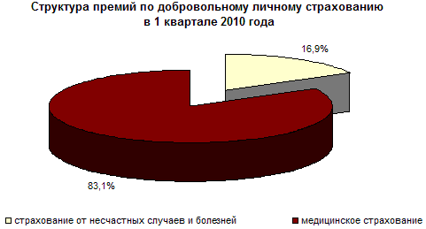 Динамика структуры страховой премии в 1 квартале 2009-2010 гг. представлена на следующем графике. Более 40% занимает ОМС, на втором месте страхование имущества – 24%, далее следует личное страхование – 18%. Незначительно увеличилась доля личного страхования (с 17% до 18%), также незначительно сократилась доля страхования имущества (с 26,8% до 24%), в остальном структура страхового рынка осталась без изменений.
