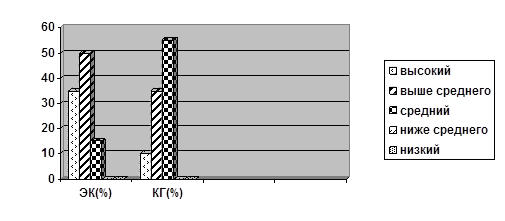 Рис. 3. Представленность уровней психического развития детей в экспериментальной и контрольной группах (констатирующий этап) Из таблиц 1 и 2, а также по рисунку 3 мы видим, что в экспериментальной и контрольной группах нет детей с высоким и низким уровнем выполнения теста «Нарисуй человека» Гудинаф – Харриса. В экспериментальной группе у большинства детей средний уровень развития сенсомоторики (52,5%), в контрольной группе с оценкой выше среднего и ниже среднего практически одинаково (25% и 30%). Таблица 3. Уровни выполнения гештальт-теста Бендер в экспериментальной группе (констатирующий этап)