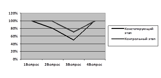При обработке результатов руководствовались рекомендациями данной методики. Ответы детей распределились следующим образом · правильно понимают смысл сказки – 10 детей (100%) · правильно определяют, «как перехитрила лиса зайца» - 100% детей (100%); · правильно определяют «кто помог зайчику и как» - 7 детей (70%); · помогли бы, попавшим в беду – 10 детей (100%). Результаты беседы по сказке «Заюшкина избушка», полученные на контрольном этапе эксперимента, сравнили с результатами констатирующего эксперимента и представили в графике. Сравнительный график изучения особенностей понимания поступков героев, умения их оценивать с позиции нравственности и морали (рис. 8).