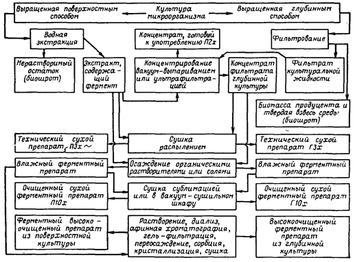 Далее в зависимости от свойств выделяемого фермента и сопутствующего ему балласта схема очистки и получения ферментного препарата может включать различные приемы и методы, такие, как концентрирование, диализ, осаждение органическими растворителями, солями, гель-фильтрование, афинная хроматография, иммобилизация, сушка термолабильных материалов и т. д. Поэтому рассмотрим этапы получения ферментных препаратов.