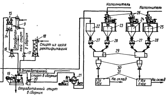 1.3.2 Технологическая схема получения очищенных ферментных препаратовСхемы получения ферментных препаратов зависят от свойств выделяемого фермента и методов очистки, примененных для получения препарата нужной степени чистоты. В качестве примера рассмотрим технологическую схему получения препаратов из поверхностной и глубинной культур в виде жидких концентратов, сухих технических препаратов, получаемых сушкой распылением, и препаратов, осажденных органическими растворителями (рис. 2). Фильтрат охлажденной культуральной жидкости собирается в основном сборнике и по мере надобности передается в сборник небольшой вместимости перед поступлением в подогреватель вакуум-выпарной установки пленочного типа. Концентрат культуральной жидкости с содержанием сухого вещества 6 – 10 % поступает в сборник концентрата. Для получения сухого технического препарата концентрат направляют в башню распылительной сушилки 8. Сухой препарат через циклон 10 ,бункер 11 и шнек 12 попадает на стадию стандартизации, фасования и упаковывания.