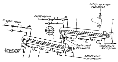 Более перспективным в этом отношении является экстрактор непрерывного действия фирмы «Ниро Атомайзер» (Япония), работающий под избыточным давлением (рис. 6). Экстрактор представляет собой наклонную цилиндрическую емкость, снабженную двумя шнеками, теплообменными рубашками и насосами. Культура через дозирующее устройство 5 подается внутрь цилиндра, а с противоположной стороны вводится растворитель (вода). Экстракт выходит из установки через самоочищающийся фильтр, а биошрот удаляется с противоположного конца. В случае необходимости, если ферменты экстрагируются не полностью, можно осуществлять двухступенчатое экстрагирование, увеличивая длительность процесса. Вторичный экстракт может быть использован в качестве растворителя для первой ступени экстрагирования. Общая продолжительность экстрагирования регулируется частотой вращения шнеков. Вторичный биошрот используется как компонент среды или после обеспложивания в кормопроизводстве.