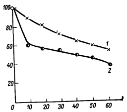 1.3.5 Концентрирование ферментных растворов методом вакуум-выпариванияЭкстракты из поверхностных культур микроорганизмов и фильтраты глубинной культуры являются нестабильными при хранении. Для получения готовых форм технических препаратов (П2х и Г2х) их необходимо сконцентрировать. Чаще всего для этих целей в технологии ферментных препаратов используются методы вакуум-выпаривания. Вакуум-выпаривание также применяется как один из этапов получения сухих технических или очищенных ферментных препаратов. Ферменты очень чувствительны к температуре выпаривания, поэтому основным условием концентрирования ферментных растворов является кратковременное ведение процесса при низких температурах кипения, чтобы выпариваемая жидкость не перегрелась, а ферменты не инактивировались. Следует учитывать, что чем чище раствор, чем меньше он содержит сопутствующих веществ, тем ферменты более чувствительны к воздействию высоких температур (рис. 11). При концентрировании экстрактов из поверхностных культур инактивация ферментов значительно меньше, так как в экстракте содержится очень большое количество защитных соединений, которые препятствуют инактивации ферментов. При концентрировании фильтратов культуральной жидкости наблюдаются несколько большие потери, поэтому ферменты культуральной жидкости стабилизируют различными соединениями (табл. 2). В процессе концентрирования ферментных растворов происходят изменение растворимости многих соединений и выпадение их осадков, и суммарное содержание сухого вещества в концентрате снижается на 11 – 20 %, изменяется рН концентрата (рис. 7). В осадок выпадают минеральные соли, некоторые органические вещества и продукты их распада, наблюдается потеря азота в результате уноса аммиака.