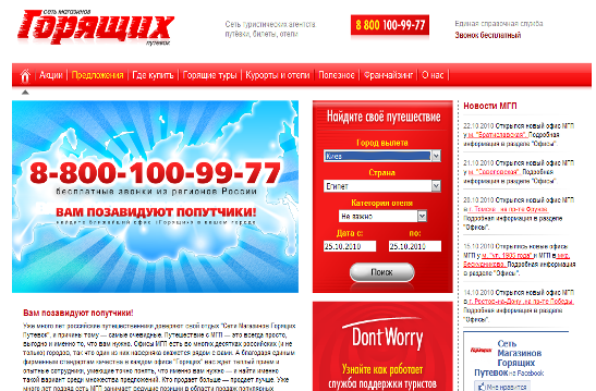 Рис.3 Веб-ресурс турфирмы «Магазин Горящих путевок» Активно развиваются корпоративные системы бронирования через Интернет. Ведущие украинские туроператоры, лидеры рынка, такие как "Козирный тур"(рис.4), "ВсеСвит", "МегаТур" и другие, уже не первый год используют так называемые Busines-to-busines системы взаимодействия туроператор – турагент. Турагент из базы туров, размещенной в Интернете, выбирает одно из предложений, заносит свои реквизиты, данные на туристов, которые попадают во внутреннюю базу туроператора. Система автоматически - в реальном режиме времени пересчитывает изменения в ценах на турпакеты, учитывает нестандартные размещения и выполняет другие функции. При этом агентство в реальном времени может проследить этапы прохождения заказа, оценить загрузку отелей, рейсов и т.п.