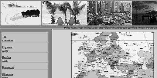Рис.11. Подбор тура При разработке страниц веб-ресурса были использованы следующие html-теги: Структура html-документа Тэговая модель - описывает документ как совокупность элементов несущих информационную нагрузку, каждый из которых окружен тэгами. Тэги HTML - это последовательность символов, начинающаяся знаком «<» и заканчивающаяся знаком «>». Все, что расположено между <HTML> и </HTML> - это документ являющийся кодом HTML, который заключает в себе все другие тэги HTML и все информационное содержание документа. Документ обычно состоит из заголовка и тела документа. Заголовок документа содержит информацию о самом документе. <HEAD> - тег заголовка документа; <TITLE> - тег название документа, появляется в строке заголовка InternetExplorer и в списках журнала (History) и папки Избранное (Favorites). Тело документа HTML содержит весь текст, несущий информацию и все тэги HTML, используемые для форматирования текста. Тело документа размещается сразу же после заголовка в тэгах <BODY> </BODY>. Элемент BODY имеет атрибуты: BACKGROUND= «» - определяет фон, на котором отображается текст документа. BGCOLOR= «#XXXXXX» - цвет фона; TEXT= «#XXXXXX» - цвет текста; VLINK= «#XXXXXX» - цвет пройденных гипертекстовых ссылок LINK= «#XXXXXX» - цвет гипертекстовых ссылок ALINK= «#XXXXXX» - цвет ссылки, которая в данный момент активизируется «#XXXXXX» - определяет цвет в терминах RGB - красный, зеленый, синий. Если один или более параметров цвета текста и ссылок не определены, то по умолчанию цвета для них задаются следующим образом: LINK=blue, ALINK=red, VLINK=purple. Элементы управления разметкой. <P> - используется для того, чтобы обозначить начало нового абзаца. Имеет атрибут ALIGN , используемый для изменения выравнивания внутри абзаца, может принимать со следующие значения: ALIGN=LEFT - выравнивание по левому краю; ALIGN=RIGHT - - выравнивание по правому краю; ALIGN=JUSTIFY- выравнивание по левому и правому краям; ALIGN=CENTER - центрирование. <BR>- принудительный перевод строки. Стили заголовков. Язык HTML поддерживает шесть стилей заголовков, которые используются для того, чтобы в различной степени выделять текст. Стили нумеруются от одного до шести, причем стиль номер один является самым крупным по размеру шрифта. Для того, чтобы разметить текст каким-либо из стилей заголовков, следует заключить его в тэги <Hn> </Hn>, где n- номер стиля. Стандарт языка HTML насчитывает 11 атрибутов у элемента заголовка. Но чаще всего применяется только ALIGN. Гипертекстовые ссылки. Для записи гипертекстовой ссылки используется элемент <A>......</A>, который имеет несколько атрибутов, главным из которых является HREF (HyperTextREFrence). Содержание элемента A заключенное между тэгом начала и окончания, выделяется в тексте цветом, определенным для контекстных гипертекстовых ссылок (LINK). Другой формой использование элемента A является определение точек внутри текста на которые можно сослаться: <ANAME= «point»> Средства описания графической информации. Для того, чтобы поместить изображение внутрь страницы используется тэг <IMG> с обязательным параметром SCR= «URL». <IMGSCR= «URL»>, где URL-адрес файла, содержащего графические данные. Атрибут SCR является обязательным, а URL может указывать куда угодно. Тэг <IMG> может иметь следующие атрибуты: ALIGN - расположение текста по отношению к изображению: TOP – наверху, BOTTOM – внизу, MIDDLE – посередине. ALT= «текст» - текст, который нужно показывать вместо изображения для текстовых браузеров. ISMAP - атрибут, указывающий, что и