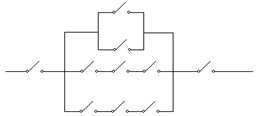 Рис.2.2. Вид переключательной схемы. Каждому переключателю схемы сопоставим пропозициональную переменную Xi, которая будет принимать значение И (истина) или Л (ложь), если соответствующий переключатель замкнут или разомкнут (то есть, не проводит электрический ток). Поскольку функция участка электрической цепи состоит в том, чтобы проводить электрический ток, то два участка, содержащие одни и те же переключатели и проводящие или не проводящие ток при одном и том же состоянии всех выключателей , мы будем считать "равными" и не различать между собой. Легко сообразить, что участку цепи, представляющему собой последовательное соединение двух переключателей X1 и X2 будет отвечать формула логики высказываний, представляющая собой конъюнкцию пропозициональных переменных X1 и X2, то есть, X1&X2 (что означает, что такой участок проводит ток тогда и тогда, когда оба переключателя X1 и X2 замкнуты), а участку цепи, представляющему собой параллельное соединение двух переключателей X1 и X2 - формула, представляющая собой дизъюнкцию пропозициональных переменных X1 и X2, то есть, X1ÚX2. Сказанное представлено на рис. 2.3.