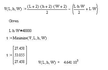 Ємність відстійника для відходів повинна складати 40000 л. Виготовляється з залізобетону товщиною 10 см. Визначити геометричні параметри відстійника (L,H,a,W), при яких на його виготовлення піде мінімальна кількість бетону (див. Рис.).