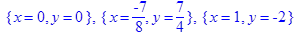 Из примера видно, что последовательность множеств, представляющих два полученных решения, сохранена в переменной answ. Для проверки правильности полученных решений, подставляем эти решения в исходную систему и вычисляем полученные выражения с помощью команды eval(). В результате вычисления системы уравнений на двух полученных решениях мы получили тождества, что говорит о правильности наших решений. Если для дальнейших вычислений необходимо иметь значения первого решения в виде отдельных переменных, то той же самой командой eval () можно извлечь их, вычислив, соответственно, неизвестную х и у на первом решении: > x1:=eval(x,answ[1]);