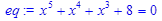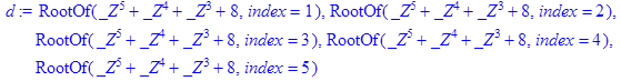 В некоторых случаях команда solve() возвращает пустую последовательность NULL. Это означает, что решения или не существует, или Maple не удалось его найти. Если не удалось найти все решения, то глобальная переменная _SolutionsMayBeLost устанавливается равной true. Последнее уравнение из примера 3. решалось без указания переменной, относительно которой следовало бы решать уравнение. Maple решил их относительно всех неизвестных величин, входящих в уравнение. Причем он выбрал неизвестную х в качестве параметра (х = х), а неизвестную переменную у выразил через введенный параметр х. Чтобы получить решение, следует параметру х присвоить произвольное значение, тогда значение неизвестной у будет определено однозначно. В общем случае полиномиальное уравнение степени выше 4 может не иметь решения, выраженного с помощью радикалов. В этом случае для представления результатов Maple использует специальную функцию RootOf(), которая применяется для обозначения любого корня выражения, заданного в качестве ее параметра: > eq:=x^5+x^4+x^3+8=0;