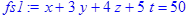 Команда solve () может решать неопределенные системы уравнений, в которых количество уравнений меньше числа неизвестных. В этом случае система Maple сама решает, какие из неизвестных принять за параметры, а какие за неизвестные, относительно которых следует строить решение: > fs1:=x+3*y+4*z+5*t=50;