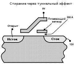 1 — USB-разъём; 2 — микроконтроллер; 3 — контрольные точки; 4 — микросхема флэш-памяти; 5 — кварцевый резонатор; 6 — светодиод; 7 — переключатель «защита от записи»; 8 — место для дополнительной микросхемы памяти. 4.Принцип действия Флэш-память хранит информацию в массиве транзисторов с плавающим затвором, называемых ячейками (англ. cell). В традиционных устройствах с одноуровневыми ячейками (англ. single-level cell, SLC), каждая из них может хранить только один бит. Некоторые новые устройства с многоуровневыми ячейками (англ. multi-level cell, MLC; triple-level cell, TLC [2]) могут хранить больше одного бита, используя разный уровень электрического заряда на плавающем затворе транзистора.