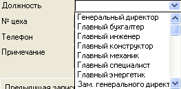 1. Сначала нам нужно выбрать пустое поле чтобы не повредить данные о других сотрудниках. Для выбора поля нужно нажать кнопку 2. В поле «ФИО» 3. Далее из списка выбирается его должность. Для выбора необходимо щелкнуть по стрелке в поле должность