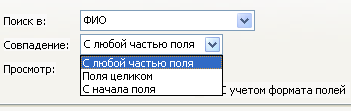 Для поиска интересующего нас сотрудника нужно ввести его фамилию в поле «Образец». Примечание: рекомендуется выбрать тип совпадений «С любой частью поля» иначе нужно будет вводить образец ПОЛНОСТЬЮ СООТВЕТСТВУЮЩИЙ записи в поле. При типе совпадений установленном как «С любой частью поля» можно будет ввести часть фамилии, и будут найдены все сотрудники чья фамилия содержит хотя бы часть введенного в поле образец текста.