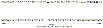 В області даних сектори називаються – кластерами. Нумерація кластерів починається з 2-го, який відповідає 33-му сектору, а останній має номер 2848 і відповідає 2879 секторові. Наприклад:Кластер 2, Сектор 33