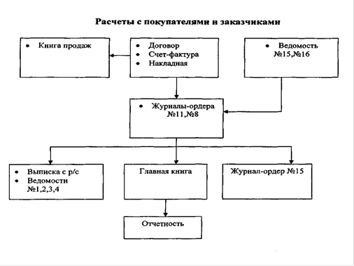 Рис.2.1 Схема организации бухгалтерии в ООО "Современная кровля" Вести бухгалтерский учет по основным средствам, кассе, расчетному счету, авансовым отчетам входит в обязанности одного сотрудника (бухгалтера). Заместитель главного бухгалтера отвечает за операции по приходу / расходу товара и материалов, проведение инвентаризаций по складу, составление актов сверки с контрагентами. Главный бухгалтер составляет бухгалтерскую отчетность и осуществляет контроль за работой бухгалтерии. Учетная политика предприятия включает рабочий план счетов бухгалтерского учета, содержащий синтетические и аналитические счета, необходимые для ведения бухгалтерского учета расчетов за товары и услуги в соответствии с требованиями своевременности и полноты учета и отчетности; правила документооборота и технологии обработки учетной информации по расчетам за товары и услуги. В учётной политике предприятия оговорено, что бухгалтерский учёт ведётся с применением компьютерной программы "1С: Бухгалтерия". 2.2 Организация учета расчетов с покупателями и заказчиками в ООО "Современная кровля"В расчетах с покупателями применяется как наличная так и безналичная форма расчетов. Расчеты наличными производятся с июля 2007 года 100000 рублей по одной сделке. В безналичном порядке расчеты проводятся только через банки и другие кредитные организации. Расчеты с покупателями и заказчиками производятся платежными поручениями, платежными требованиями-поручениями, в порядке уступки права требования, векселями. При расчетах с поставщиками и подрядчиками наличными денежными средствами оформляются авансовые отчеты на основании выданных контрагентами квитанции к ПКО и кассового чека. Взаимозачетная операция является односторонней сделкой и может быть совершена одной из сторон с уведомлением другой стороны при отсутствии разногласий по проведению взаимозачета. Сторона, принявшая решение о проведении взаимозачетной операции, оформляет заявление о проведении зачета. Сделка по проведению взаимозачета вступает в силу с момента получения этого заявления другой стороной. Подтверждением получения заявления другой стороной необходимо считать квитанцию, уведомление о получении и так далее. Особенности документооборота при расчетах с покупателями и заказчиками в Обществе с ограниченной ответственностью "Современная кровля" представлены на рисунке 2.2.