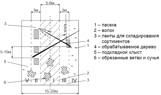 Рисунок 1 Радиальная схема размещения трелевочных волоков Выбор схемы разработки пасек При механизированном способе разработки лесосеки, когда вывозятся сортименты, используется система бензопила и форвардер. При использовании данной системы машин операции валка, обрезка сучьев и раскряжевка выполняются бензопилой непосредственно у пня. Окучивание сортиментов производится вручную вдоль волока с использованием специальных приспособлений. Сбор сортиментов и транспортировка производится форвардером. При сплошных рубках главного пользования ширина пасеки принимается 15 – 20м и условно делится на 5 лент.