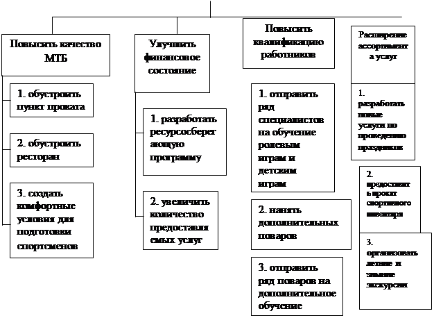Рис. 1 Дерево целей Глобальная цель организации – открытие круглогодичного направления, которое обеспечит увеличение прибыли организации. Ресурсы для обеспечения цели организации: - утепленные домики для проживания в любое время года, с обогревателями, холодильниками; - спортивный инвентарь: лыжи + лыжня; - автомототехника: джип, снегоходы; - рекламная кампания. - персонал для функционирования базы и проведения Нового года и корпоративных праздников. Конкретные цели организации: - подготовить осенью домики для зимнего сезона. - рассчитать и начать действия по выполнению рекламной компании. - закупить спортивный инвентарь и автомототехнику. - сформировать трудовой коллектив. - рассчитать цены на новые услуги. Выбор маркетинговой стратегии: Наиболее всего в данной сложившейся ситуации предприятию подойдет стратегия концентрированного маркетинга, так как турбаза сосредотачивает свои усилия на двух группах потребителей- молодые люди со средним достатком до 35 лет и профессиональные спортсмены. Оригинальность и уникальность услуг с учетом низких затрат на рекламу и их продвижение должны обеспечить лидерство в выбранном сегменте. Во-вторых данная стратегия наиболее привлекательна для организаций с ограниченными ресурсами, и при благоприятном течении обстоятельств может обеспечить устойчивую позицию на рынке. Выбор типа маркетинга : Так как спрос на услуги турбазы нерегулярный, то есть варьируется в зависимости от времени года, то наиболее предпочтительным окажется для данной ситуации синхромаркетинг. На данной турбазе наиболее низкий спрос наблюдается в мае и июне. Повысить спрос в эти месяцы возможно с помощью скидок и акций или предоставлением части услуг бесплатно. Товарная политика: На предприятии используются следующие направления товарной политики: -создание новой продукции (экскурсии, лыжи, баня и т.д.); -стратегия организации сервисного обслуживания. Ценовая политика : Важнейшими принципами ценообразования на данном рынке являютсяминимальные издержки и эффективное распределение факторов производства. Минимизация издержек в среднесрочном и долгосрочном периодах во многом зависит от степени использования результатов научно-технического потенциала: применения новой техники, ресурсосберегающих технологий, повышения производительности труда. Эффективное распределение факторов производства предполагает оптимальное их соотношение для производства товаров, на которые предъявлен потребительский спрос. Для турбазы «Динамо» существуют 2 цели ценовой политики: - удержание рынка; - максимизация прибыли. Большое число покупателей и завоевание большой доли рынка будет обеспечивать стратегия прочного внедрения на рынок. Методы ценообразования: Поскольку организация оказывает различные, сильно отличающиеся друг от друга услуги, то логичнее всего будет использовать различные методы ценообразования применительно к каждой конкретной услуге. Это объясняется также тем, что для некоторых видов услуг определение себестоимости является довольно проблематичным. Ценовая тактика предприятия: На турбазе «Динамо» применяется следующая ценовая тактика: установление гибкой цены. В некоторых случаях турбаза предлагает скидки. Скидки: Скидки суммируются. · на период с начала мая по конец июня – 10% при размещении на 3 и