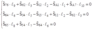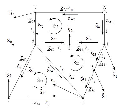 Далее выражаем линейные мощности через контурные и нагрузочные мощности. Для этого для каждого узла составляем уравнения согласно первому закону Кирхгофа. Полагаем, что Для узла 7: Для узла 6: Для узла 2: Для узла 5: Для узла 4: Для узла 3: Для узла 1: Заменяем линейные мощности в (2) полученными для них выше выражениями. В результате получаем следующую систему уравнений: