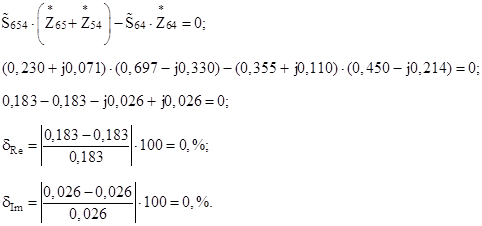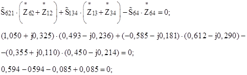 Сделаем проверку по второму закону Кирхгофа в отношении полных мощностей для каждого из трёх контуров. Для первого контура: