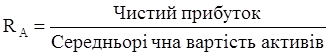 Рентабельність активів (інша назва – коефіцієнт “прибуток/актив”) характеризує, наскільки ефективно підприємство використовує свої активи для отримання прибутку, тобто показує, який прибуток приносить кожна гривня, вкладена в активи підприємства. Рентабельність виробничого капіталу (фондів) (RВФ) визначають як відношення чистого прибутку до середньорічної вартості основних засобів та середніх залишків оборотних активів: