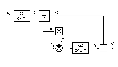 Де Uк.мах – максимальне значення напруги керування тиристорним перетворювачем. Приймаємо Uк.мах = 10 В. Таким чином передавальна функція об'єкта регулювання має вигляд :