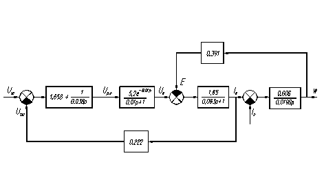 У структурній схемі струмів контур і виконавчий механізм складають об'єкт регулювання для контуру швидкості Для досягнення підвищеної швидкодії контуру регулювання швидкості, налагоджуємо його на симетричний оптимум. При цьому в якості регулятора швидкості застосовуємо ПІ-регулятор, передавальна функція якого має вигляд