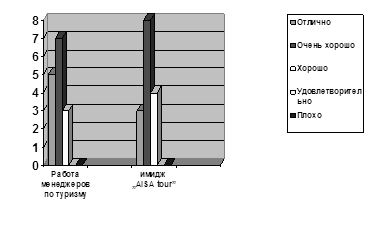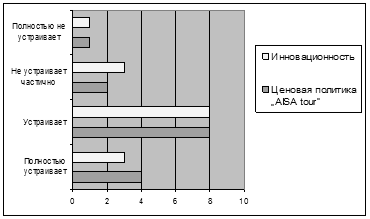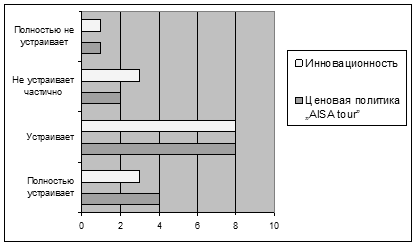 Соблюдение принципа очень часто встречается в самых разных областях. Например в том, что 20% людей обладают 80% капитала, 80% пользователей посещают 20% сайтов, или 20% покупателей или клиентов (постоянных) приносят 80% прибыли." Результаты пилотного исследования показали, что в целом имидж турагентства "AISA tour" хороший, но в будущем этого может оказаться не достаточно, чтобы оставаться конкурентоспособными. Как видно из графика №1 и №2, ценовую политику, работу менеджеров по туризму, инновационость, а также имидж "AISA tour", респонденты оценили положительно.