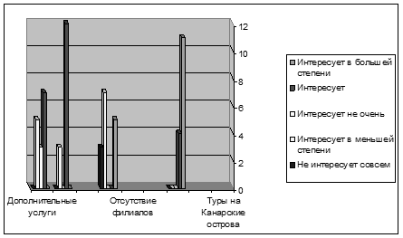 График 2 Разнообразие услуг турагентства устраивает всех из отобранных респондентов, такие результаты говорят о необходимости постоянного изучения мнения потребителей. Какие услуги интересуют клиентов в большей и меньшей степени, можно проследить по графику № 3