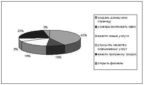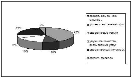 График 4 Анкета Уважаемые клиенты! Мы очень рады, что Вы предоставляете нам возможность выбирать для Вас места проведения Ваших долгожданных отпусков. Для усовершенствования работы турагентства, просим ответить на вопросы составленной нами анкеты и выслать обратно на эл. адрес director@aisa.lv, взамен мы обещаем Вам 8% скидку при заказе нового тура. Благодарим за помощь! 1. Как вы оцениваете работу наших менеджеров? - Отлично - Очень хорошо - Хорошо - Удовлетворительно - Плохо 2. Устраивает ли Вас разнообразие услуг агентства? - Да - Нет 3. Устраивает ли Вас инновационность туристического агентства? - Полностью устраивает - Устраивает - Не устраивает частично - Полностью не устраивает 4. Какие из ниже перечисленных услуг в нашем турагентстве, Вас интересуют? Пронумеруйте услуги от 1 до 5 так, что № 1- интересует в большей степени, 5 – не интересует вовсе. - Туры на Канарские острова - VIP туры - Дополнительные услуги 5. Устраивает ли Вас ценовая политика "AISA tour"? - Полностью устраивает - Устраивает - Не устраивает частично - Полностью не устраивает 6. Как Вы, в целом, оцениваете имидж "AISA tour"? - Отлично - Очень хорошо - Хорошо - Удовлетворительно - Плохо 7. Что на Ваш взгляд, необходимо сделать для улучшения имиджа "AISA tour"? Пронумеруйте варианты от 1 до 4, таким образом, что 1- самое важное, 4 - маловажное. - создать домашнюю страницу - усовершенствовать офис - ввести новые услуги - улучшить качество оказываемых услуг - ввести программу скидок - открыть филиалы Ваши комментарии и предложения: 5. Справка о состоянии внешних и внутренних коммуникаций Внутренние коммуникации 1. Собрания 2. Корпоративные праздники 3. Информационные листы 4. Доска объявлений 5. Рассылка по электронной почте Собрания работников происходит каждую неделю по средам, в разгар рабочей неделе, чтобы обсудить животрепещущие вопросы и решить возникшие проблемы. День недели выбран не случайно, т.к. в понедельник и вторник человек только начинает приходить в рабочее состояние перед выходными, а в четверг и пятницу уже морально готовится к выходным и его работоспособность снижается. Корпоративные праздники и традиции организации являются составной частью ее внутренних коммуникаций, а так же улучшения и поддерживания ее имиджа и репутации у сотрудников, что создает у них положительное отношение к турагентству и чувство сопричастности, и гордость за свою должность. Так же, это положительно сказывается на работоспособности сотрудников. Подробнее эту тему изучает такой раздел менеджмента, как "корпоративная культура организации". Информационные листы распространяются по необходимости среди работников компании, при внедрении новых правил, технологий и т.п. Чаще всего, они выглядят как инструкции. Доска объявлений, выглядит, как напоминание сотрудникам о главных событиях. Чаще всего рассылкой по электронной почте пользуются в выходные дни, когда нет другой возможности донести срочную информацию до всех сотрудников одновременно. Каждый сотрудник турагентства имеет свой собственный электронный адрес. Внешние коммуникации 1. Интернет 2. Семинары, которые проводит туроператор 3. Рекламные материалы 4. Выставки 5. Реклама на радио, ТВ 6. Общение со СМИ Своя интернет страничка турагентства "AISA tour" в связи со сменой программиста, находится в стадии разработки. Рекламные брошюры, в основном создаются для ежег