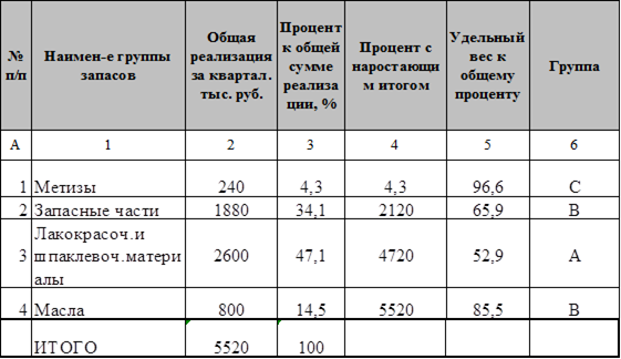 Произведенный АВС-анализ показал, что наиболее значимым для предприятия является группа запасов: лакокрасочные и шпаклевочные материалы, поскольку эта группа занимает большую часть в общем объеме реализации. Воспользовавшись следующей таблицей, продифференцировали товарные запасы по методу АВС.