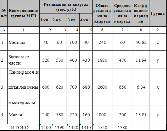 где С целью сокращения на ОАО «КАТОН» РСМУ-10 объема денежных средств, омертвленных в запасах, и усиления контроля за ассортиментом, была проведена дифференциация специально отобранных групп МПЗ с помощью анализа ХУZ. Для этого воспользовались таблицей 3.9. Таблица 3.9 – Поквартальная реализация групп МПЗ на ОАО «КАТОН» РСМУ-10