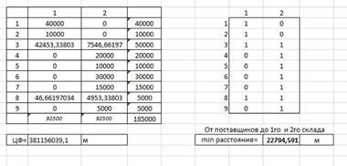 Рисунок 3 – Определение минимального расстояния от поставщиков до складов Получаем, что минимальное расстояние от поставщиков до складов, с выбранными координатами, составляет 22794,591 метров. Далее также при помощи Excel, находим расстояния от клиентов до первого и второго складов (таблица 5). Таблица 5 – Расстояния от клиентов до первого и второго складов