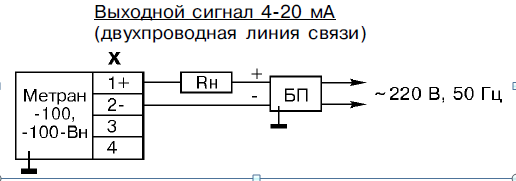 Датчик питается от 24 В постоянного напряжения. На выходе токовый сигнал 4…20 мА. Электрическая схема подключения имеет вид: