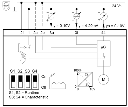 В качестве исполнительного механизма возьмем AVF 234S SUT Привод Клапана с Возвратной Пружиной для контроллеров с аналоговым (0...10 V и/или 4...20 мА) или переключаемым выходом (2- или 3-поз.управлением). Привод клапана имеет пружинную функцию с заданным конечным положением в случае сбоя питания или срабатывания ограничителя. Характеристика клапана (линейная / равнопроцентная / квадратичная) устанавливается на позиционере. Корпус из самозатухающегося, желтого пластика. Мотор постоянного тока, электроника управления, визуализация с помощью LED,передаточный механизм из закаленной стали, не требует ухода, комплект пружин, стержни монтажа из нержавеющей стали, и монтажная консоль из чугуна легкого металла для установки на клапан. Другие свойства: электронное отключение по нагрузке с помощью упора на приводе или клапане, автоматическая калибровка к ходу клапана, кодирующие переключатели для установки характеристики и времени хода, пусковая рукоятка для ручного управления на корпусе (с выключением двигателя и для вызова повторной инициализации). Возможно переключение направления действия извне (питание на разъем 2a или 2b). Электроразъемы (не более 2,5 мм2) с винтовыми разъемами. Три открываемых кабельных ввода для M20×1,5 (2×) и M16×1,5. Монтаж от вертикального (не перевернутого) до горизонтального положения.