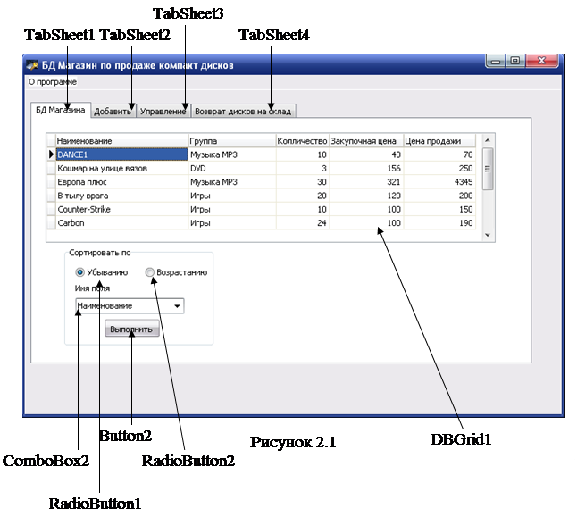 Результатом курсовой работы является полноценное приложение с графическим интерфейсом, которое может считаться полноценной программой. После её запуска пользователю предоставляется возможность просмотреть существующую БД компакт дисков, отсортировать её по возрастанию или убыванию со следующим параметрам: наименование, группа, количество, закупочная цена и цена продажи. Так же пользователь имеет возможность самостоятельно добавить запись в базу данных, отфильтровать и удалить указанные записи.