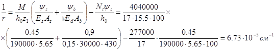 284506Н. см < 1942000 Н. см Умова виконується отже початкові тріщини не утворюються; де Розрахунок прогину плити Прогин визначається від постійного та тривалого навантаження, граничний прогин Замінюючий момент рівний вигинному моменту від постійного та тривалого навантажень М=40,4 кН. м; сумарна повздовжня сила рівна зусиллю попереднього обтиску з урахуванням всіх втрат і при γsp =1; Ntot =P2 =277 кН; ексцентриситет