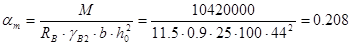 4.2 Розрахунок міцності ригеля по перерізам нормальним до повздовжньої вісі Характеристики міцності бетону і арматури Бетон важкий класу В20; розрахункові опори при стисканні Rb =11,5 МПа; при розтягу Rbt =0,9 МПа; коефіцієнт умов роботи бетону γb2 =1; модуль пружності Еb =27000 МПа. Арматура повздовжня робоча класу А-ІІІ, розрахунковий опір Rs =365 МПа, модуль пружності Еs =200000 МПа. Визначення висоти перерізу ригеля Висоту перерізу ригеля підбираємо по опорному моменту при ξ=0,35, оскільки на опорі момент визначений з урахуванням утворювання пластичного шарніра. По таблиці 3.1 [1] і при ξ=0,35, знаходимо значення αm =0,289, і визначаємо граничну висоту стисненої зони
